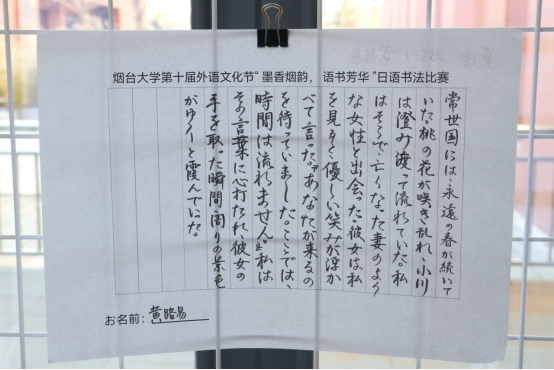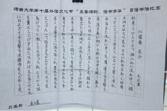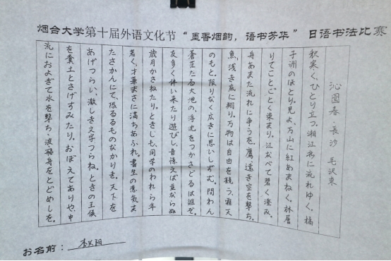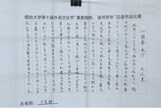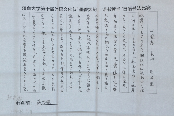 学生们在书法作品中表达出了对本国文化的热爱、对异国文化的尊重,展现出了极高的艺术素养,深刻彰显出对日语书法独特魅力的深刻领悟。墨舞金秋,笔韵传情,每一滴墨香都承载了学生对烟大建校四十周年的深切祝福、对传统文化的深情致敬。同学们以笔墨为媒,以语言为桥,书写了烟大一路走来的光辉历程,展现出了新时代烟大青年的风采与魅力。此次大赛的成功举办不仅充分展现出学生积极向上的精神风貌和勇于挑战自我、展示自我的青春活力,同时进一步巩固了中日文化友好交流的基石,促进了文化互鉴与交流。
