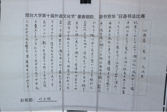 为弘扬中国诗词之韵,书法艺术之美,搭建文化交流之桥,推进中日文化交融与发展,恰逢第十届外语文化节举办之际,外国语学院于2025年10月31日至11月4日举办烟台大学第十届外语文化节暨2025“九外杯”日语书法比赛。参赛作品由日语系2位老师,4位工作人员,6位匿名评审同学,樱花日语志愿小组全程策划执行。